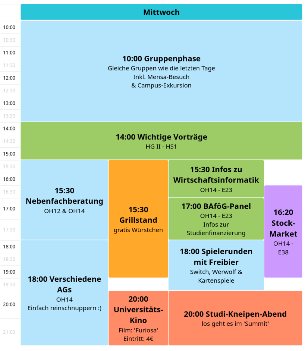 » Studiumsbeginn Wintersemester 2024/25» Zeitraum: Montag, 30.09.2024 bis Freitag, 04.10.2024 (meistens von ~10 bis ~18 Uhr)