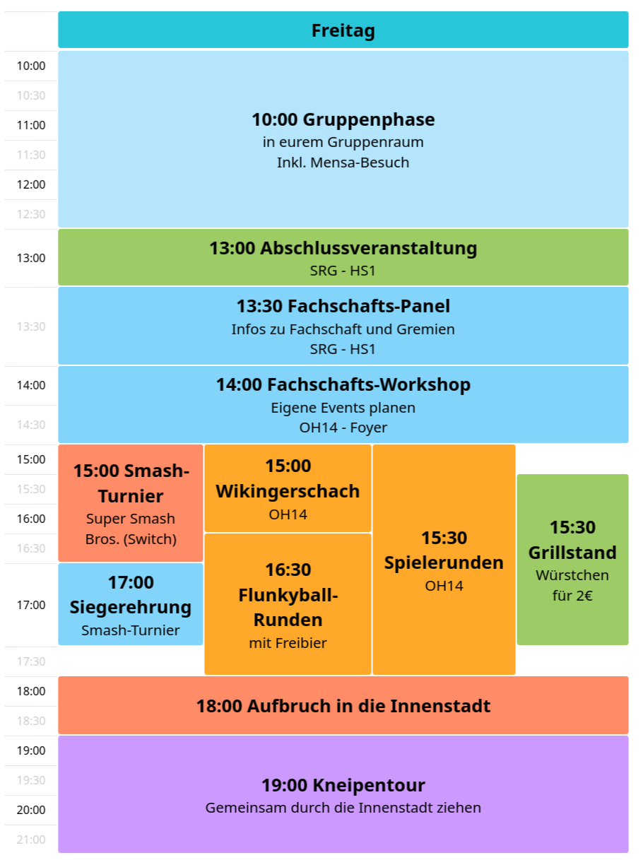 » Studiumsbeginn Wintersemester 2024/25» Zeitraum: Montag, 30.09.2024 bis Freitag, 04.10.2024 (meistens von ~10 bis ~18 Uhr)